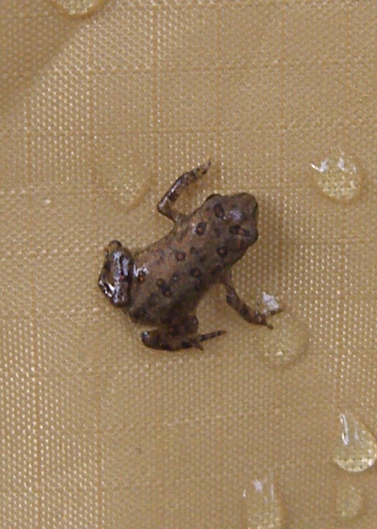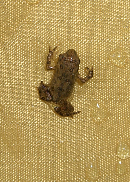 The lines in the tent fabric are about 3.7 mm apart, so the frogs are perhaps 10 mm from snout to butt. That size rules out everything in our RTP Eastern Reptiles & Amphibians book except the Little Grass Frog, which used to live only south of Virginia. The spot pattern doesn’t match, either, although they’re said to be highly variable. Who knows what’s going on in these degenerate days?