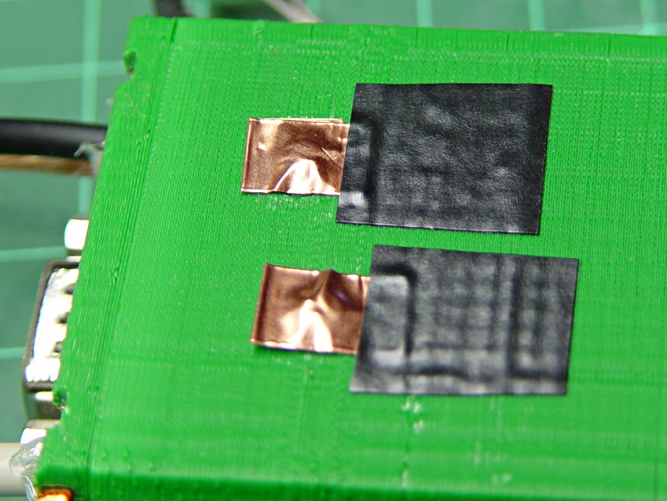 The black tape adds emphasis to the lightly sticky end of the copper tape. The folded-under ends lie to the left in the picture, so there’s a continuous copper sheet connecting the radio battery contacts to the screw heads on the green case. It’s not a huge cross-sectional area, but … it’s better than no area at all.