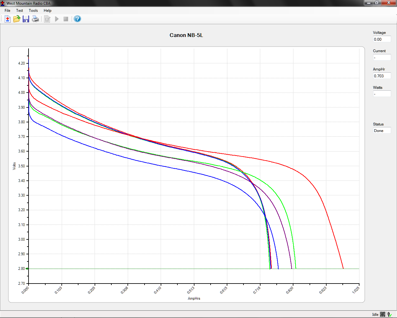 The red line off to the far right is the three year old Canon OEM battery, which remains far and away the best battery at 1 A·h.
