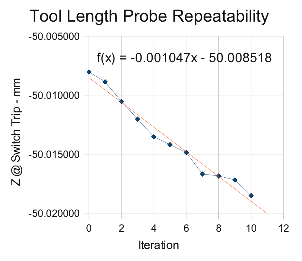 So I did that and here’s the result. The second column is the indicator reading in mils, with negative numbers being further down toward the tooling plate. The third column is the Z-axis coordinate of the probe switch trip in mm.