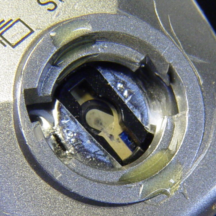 That’s measured with the hole-depth tang of a caliper, sitting atop the screw head. I don’t believe there’s 0.1 mm accuracy in the measurements, but they’re close enough. I did file off a few mold flash bumps from the shutter button & bezel during this adventure.