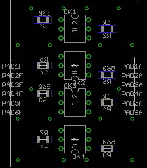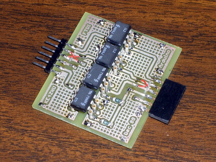The layout puts the DIP isolators on the top and the SMD resistors on the bottom. I used fancy screw-machine IC socket pins, just because I had some, but you could solder the isolators directly to the board. The FTDI Basic connects through header pins and the Arduino connects through female header sockets, both soldered sideways to the top of the board. I’ll eventually reinforce them with some epoxy, never fear.