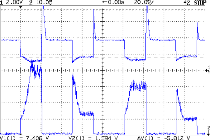 The top trace is the drain voltage and the bottom trace is the LED current at 50 mA/div.
