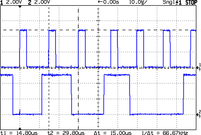 If you’re going to have to write some code to get input bits anyway, you may as well use the ATmega168 (and its ilk) hardware SPI as it was intended to be used: for high-speed synchronous serial I/O. This scope shot shows the SPI clock (in the top trace again) ticking along at 1 µs per bit, which is 1/16 the Diecimila’s oscillator frequency. You can pick any power of two between 1/2 and 1/128; I used 1/16 because it’s fast enough to make the rest of the software the limiting factor, while slow enough to not require much attention to layout & so forth.