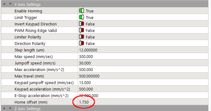 The speed and acceleration values are much lower than used with the linear Y axis, because apparently Ruida computes the corresponding step values using the workpiece diameter in the Rotary section. Small diameters produce impossibly fast motions, which suggests they expect you to set the optimum values based on back-calculations from the object diameter; ain’t nobody got time for that.