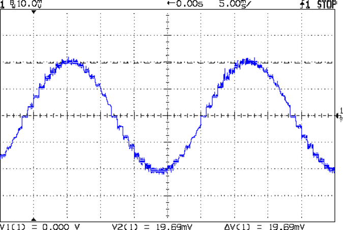 The driver runs in 1/8 microstep mode, which means 1 revolution = 8 × 200 step = 1600 steps. Each cycle of that stepped sine wave has 32 microsteps = 4 full steps/cycle × 8 microsteps. One cycle is about 27 ms, so 1 step = 840 µs → 1200 step/s → 0.74 rev/s → 44 rpm. The Thing-O-Matic runs at 47 step/mm → 34 mm/rev, so this speed corresponds to travel at 25 mm/s, roughly the usual printing pace.