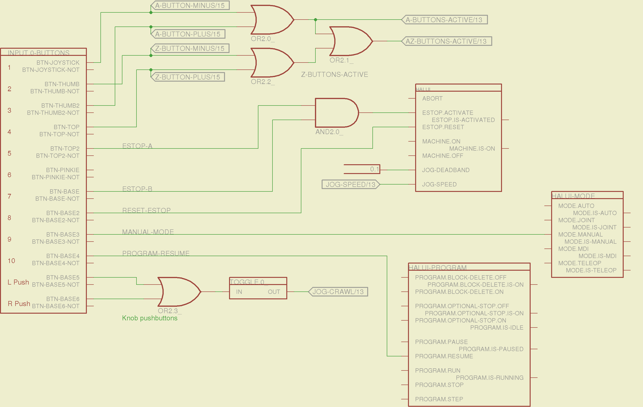 loadrt constant count=13 loadrt and2 count=17 loadrt conv_float_s32 count=1 loadrt flipflop count=4 loadrt mux2 count=5 loadrt mux4 count=1 loadrt not count=8 loadrt or2 count=14 loadrt scale count=7 loadrt timedelay count=1 loadrt toggle count=1