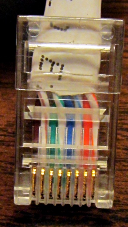 Turns out I was moving that router upstairs to get a better signal for folks out in the driveway and snaking the cable through the only suitable (i.e., existing) hole in the floor required cutting the molded-in-place connector off, then crimping a new one on. Both you and I know those wires must cross, but in the excitement of pushing all those wires into the connector, well … so it goes.