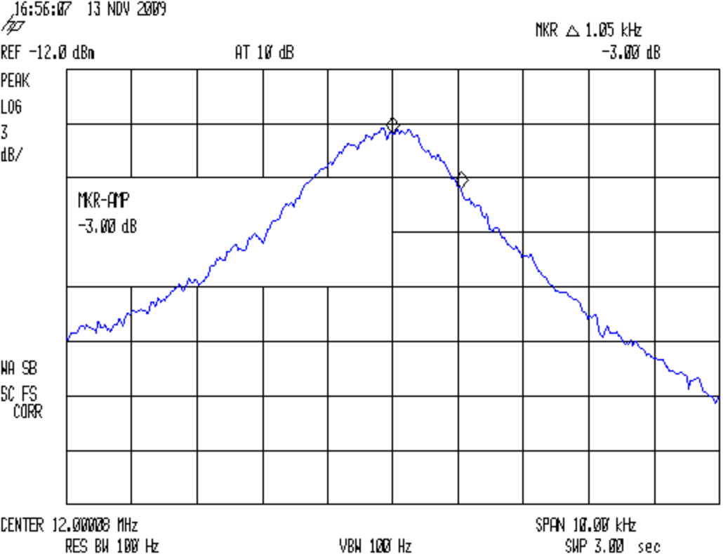Marker delta, dial up the marker frequency, poke marker amplitude, set -3 dB, read off the marker delta frequency. Dial the marker frequency down to the other side of the peak, set amplitude -3 dB again, read off the frequency again. Compute the crystal’s 3-dB bandwidth BW as the sum of those two values.