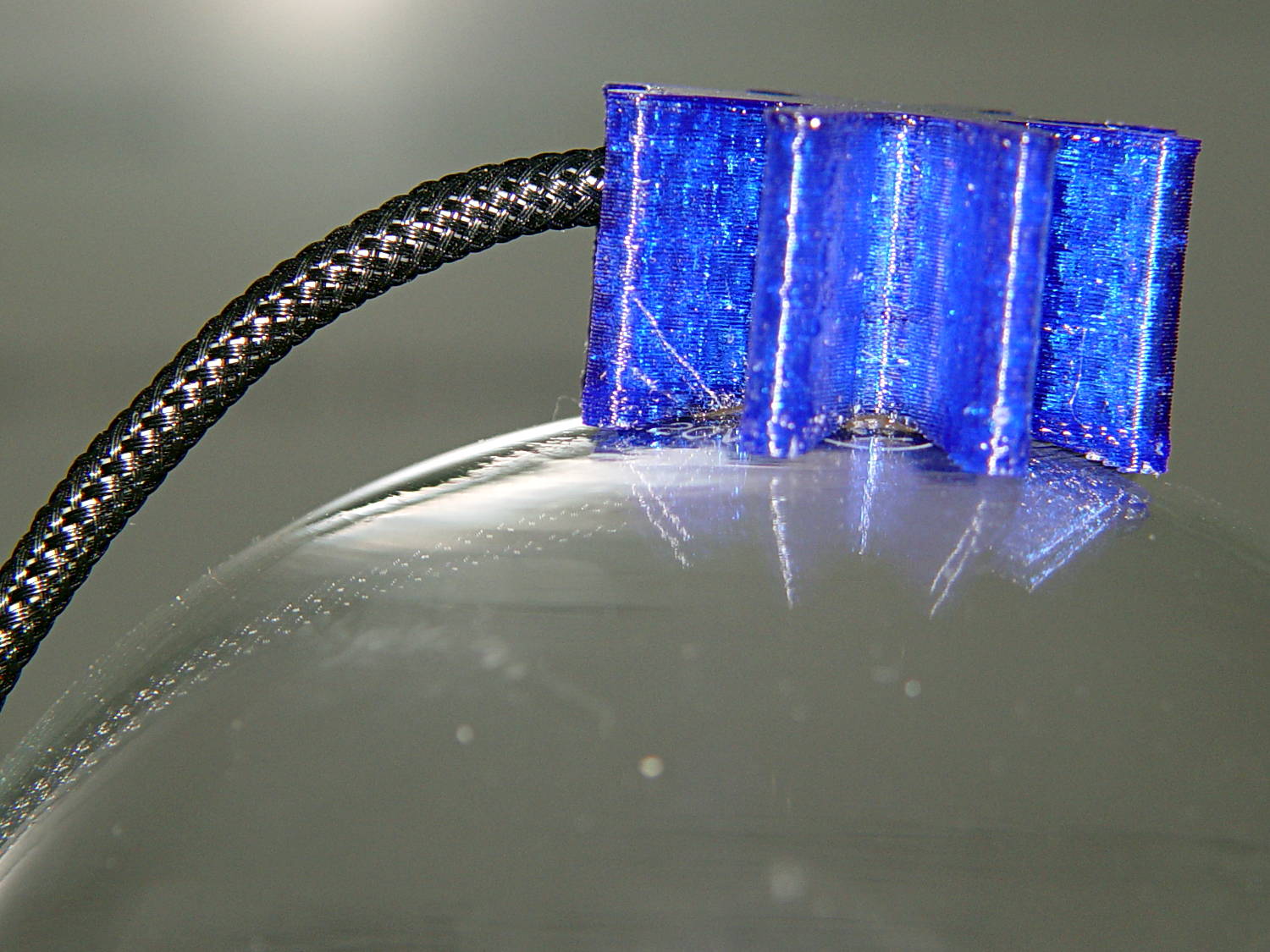 That looked better from the top side (where it was completely hidden) and came heartbreakingly close to working, but after about a day the cable + braid put enough torque on the cap to peel it off the bulb. Obviously, the tape holds much less enthusiastically after that.
