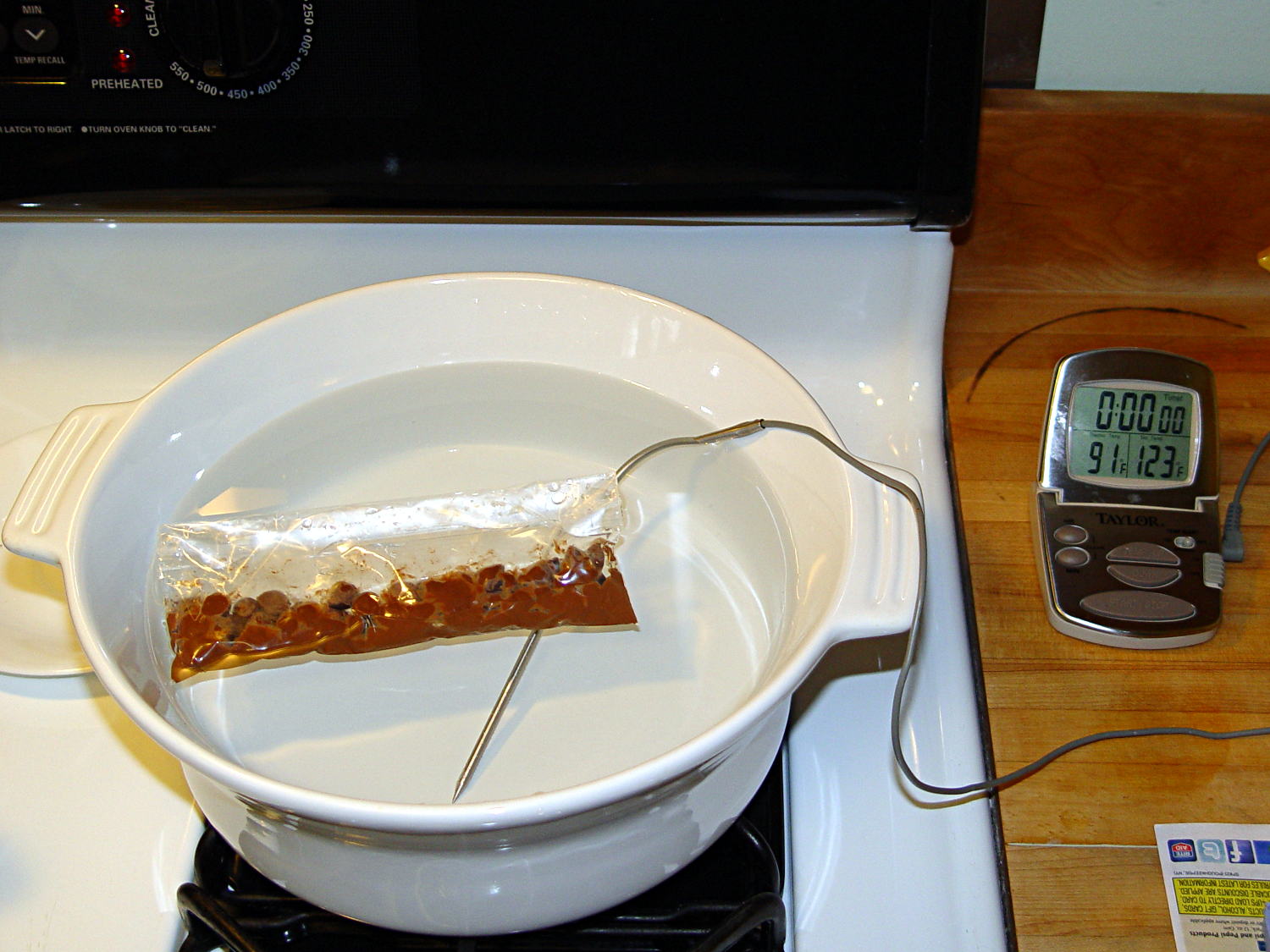 Put chocolate chunks into bag, squeeze out as much air as possible, seal, drop in the pot. Wait a few minutes until it’s not quite completely melted, remove, dry the bag, squeeze out the rest of the air, then knead until it’s all mooshy.