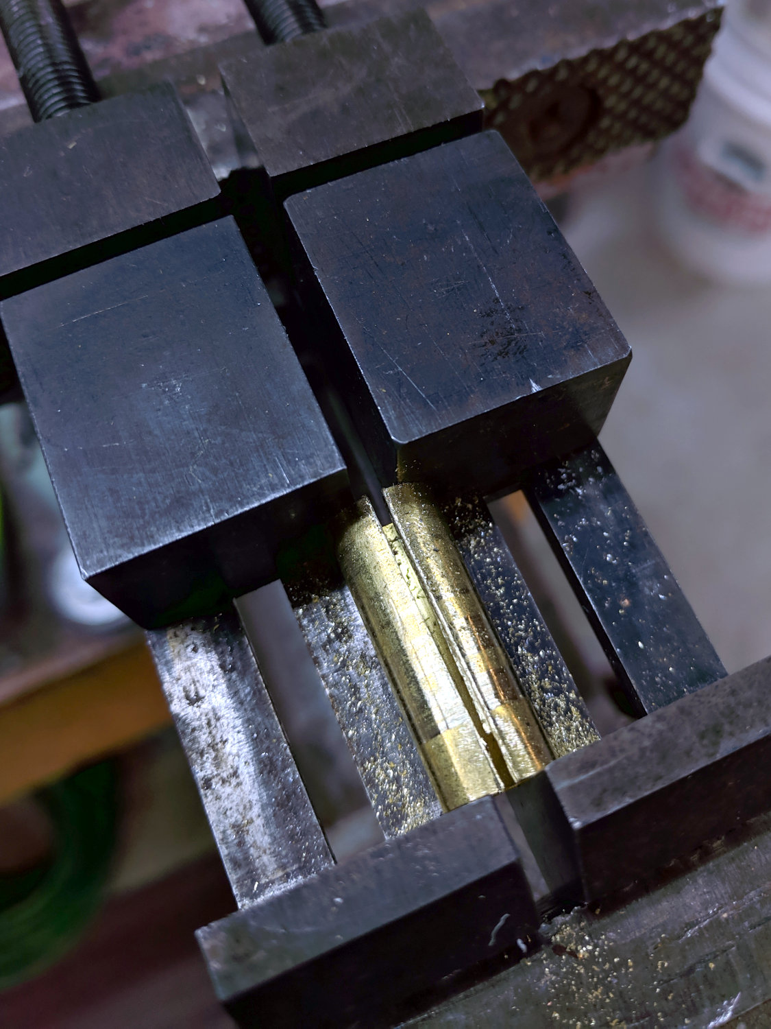 I blued the bit, kissed it against the drilled bore, filed off whatever wasn’t blued, and iterated until the carbide edge started cutting. Sissy cuts all the way, with no pix to show for all the flailing around.