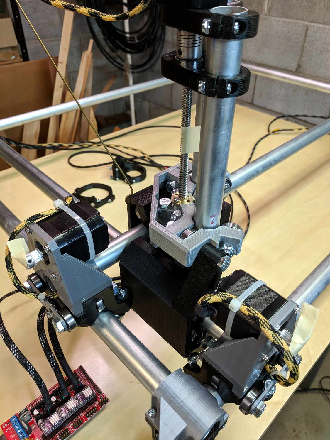 Part of the tweakage will be to sort that out; a 24 V supply may be in order. Driving each motor separately (as required for automatic de-racking homing) at 1.5 A/phase would require 31.5×√2 A/motor × 5 motors = 15 10.5 A, which seems excessive even to me, particularly in light of sending it across a RAMPS board. At 1 A/phase, you need 10 7 A, which falls within the realm of reason and would be kinder to the PLA motor mounts. It’s not clear boosting the motor voltage will produce any real benefit, although giving the drivers more headroom seems reasonable.