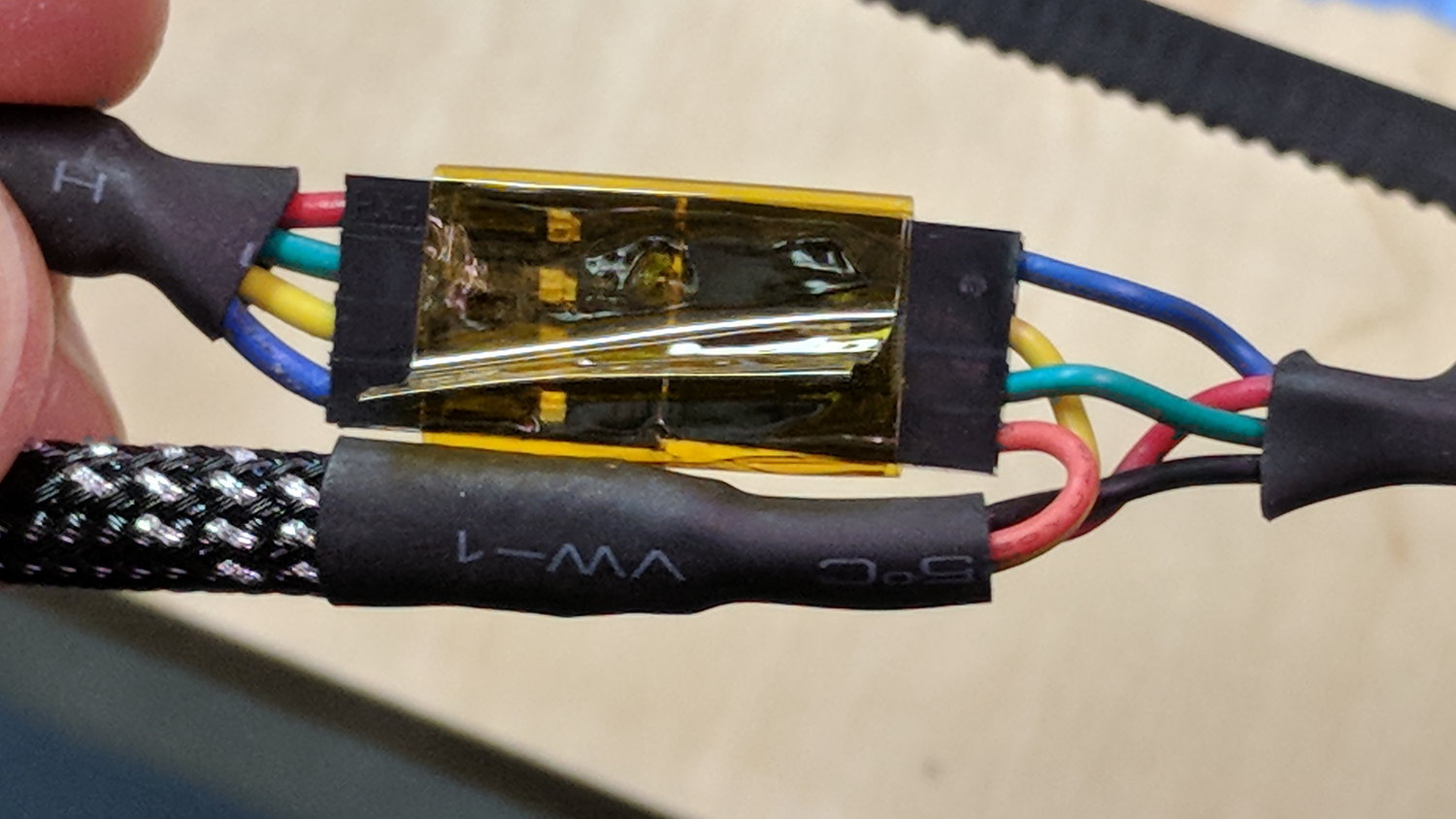 The joint at the middle of the harness, with the near-end stepper cable on the upper left: