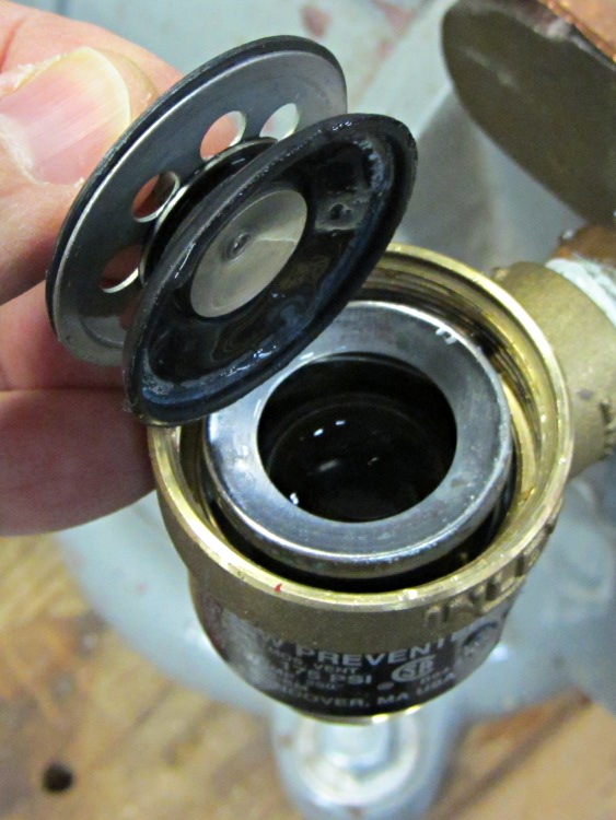 A complete new valve is $40, in stock and ready for pickup at Lowe’s, but all I really needed was the failed rubber flapper valves, which they don’t carry. A few minutes of searching reveals the Watts 0886011 Repair Kit, which has all of the interior parts.