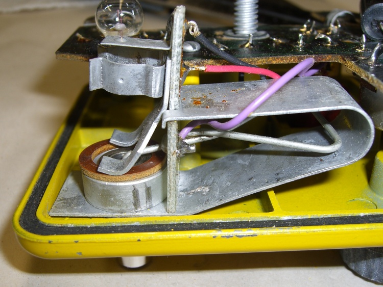 A wedge on the top half presses down on the middle of the steel bar, pressing it into the rheostat. A dab of silicone lube on the wedge greatly improved that action.