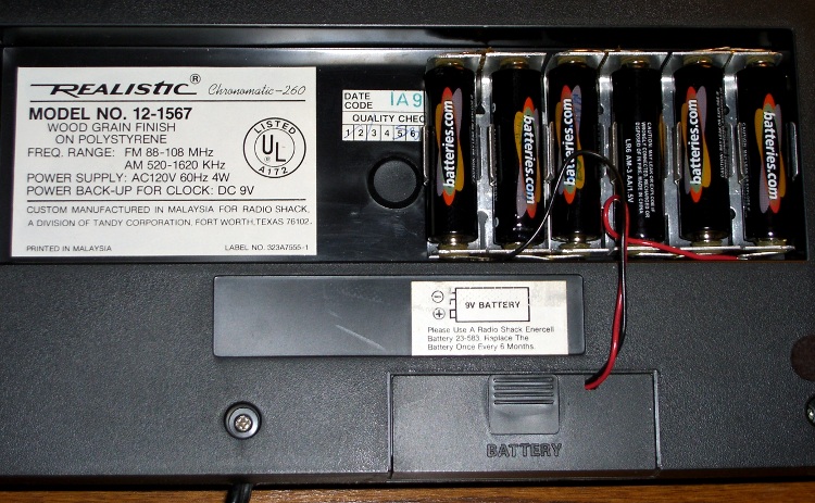 The little red Battery Sentinel LED on our old Realistic (a.k.a. Tandy a.k.a. Radio Shack) clock radio was on this morning, which means that, once again, the backup battery needs attention.