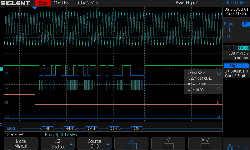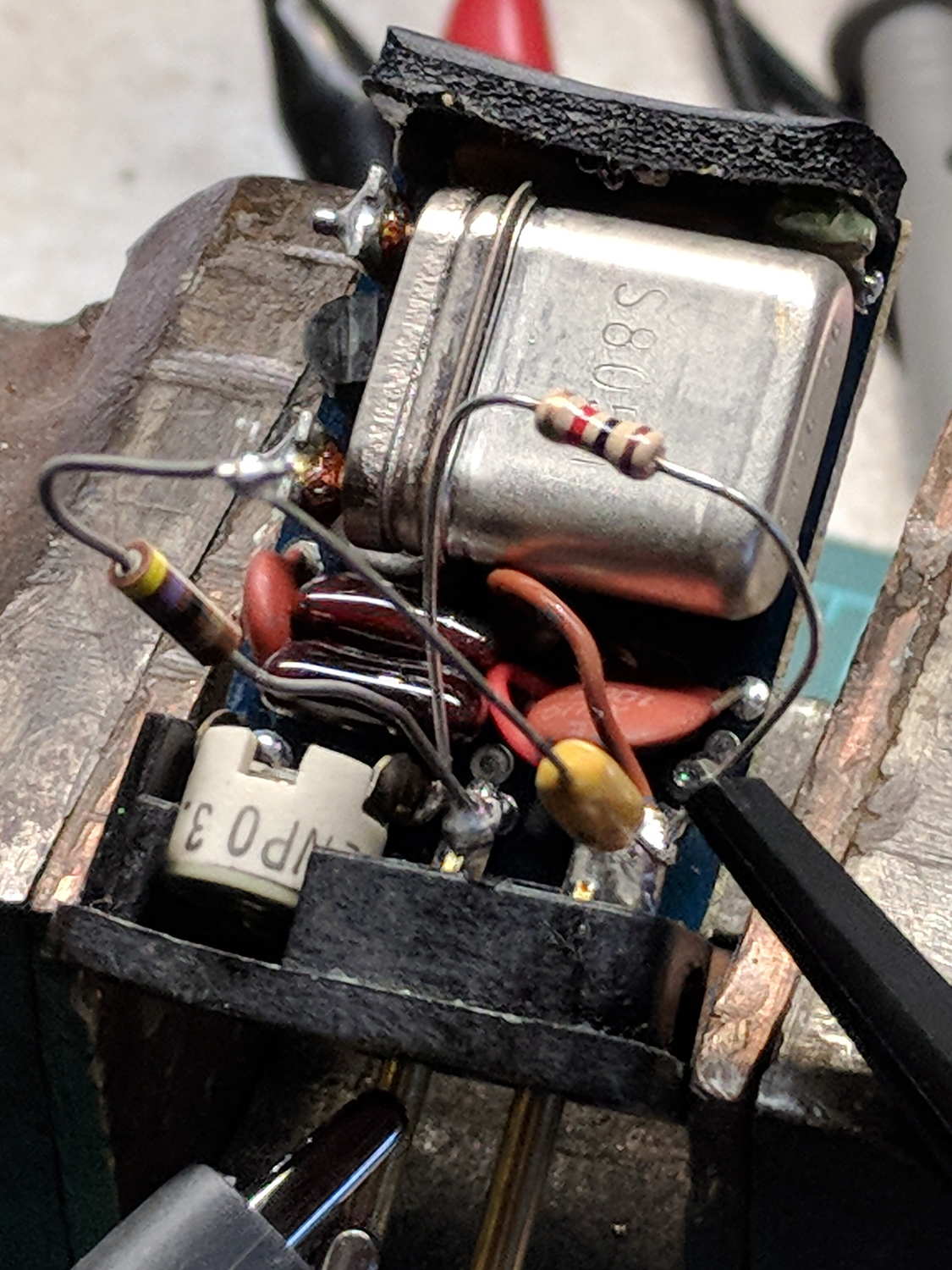 Here’s the 40 meter output, with the J3 jumper in place and the probe jammed into the header: