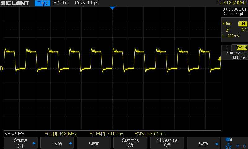 The QRPme Pocket Pal II produces RF test signals in the 20 meter and 40 meter bands, both square-ish waves derived from its 14.31818 MHz oscillator-in-a-can: