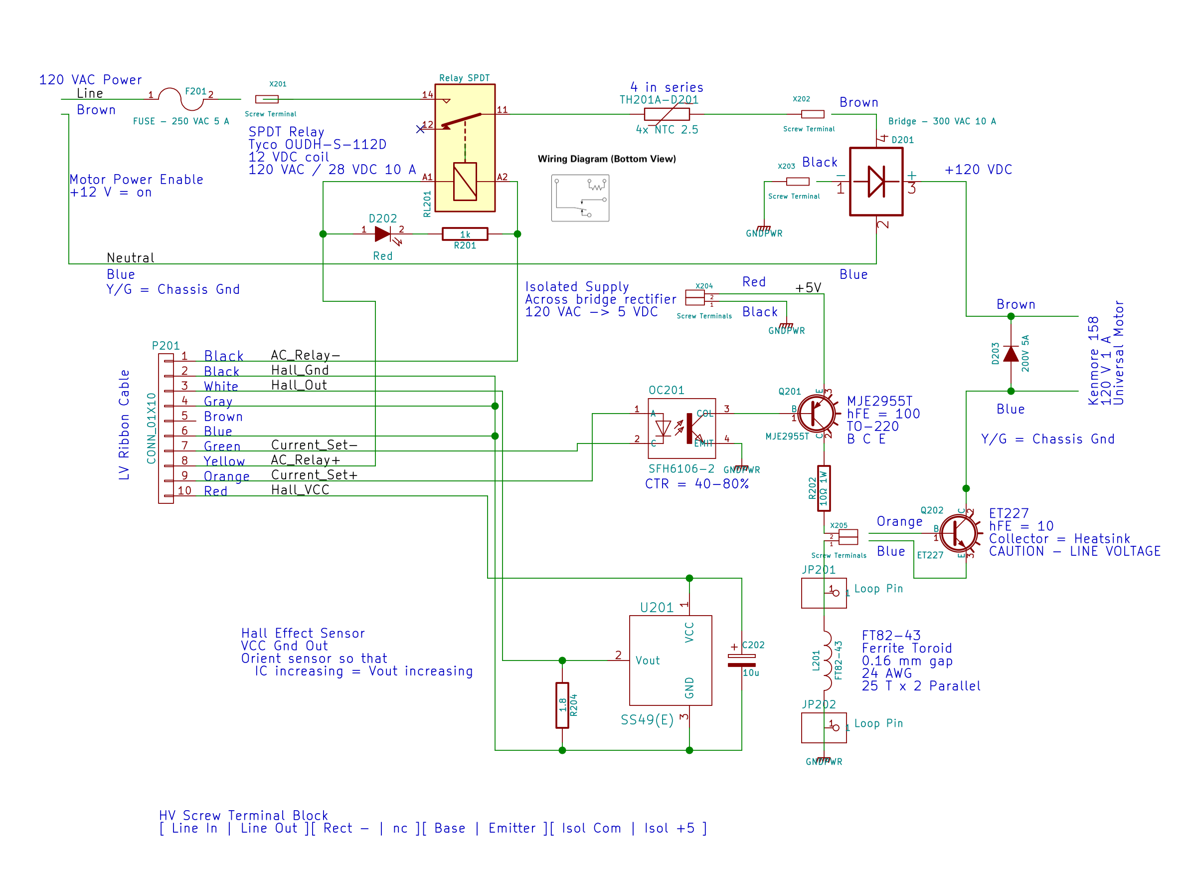 The Tek probe in the lower trace goes on the green wire connecting the diode to the bridge rectifier, oriented to match the diode polarity (+ current flows from motor to blue wire on collector to brown wire on rectifier to motor):