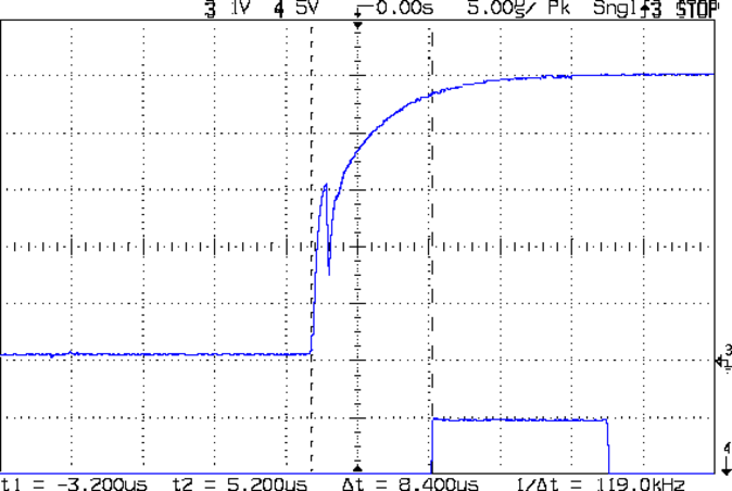 The scope trace shows that the handler takes about 7 µs to get control after the glitch (the left cursor should be on the falling edge, not the rising edge), so the input read occurs when the sensor output is over 4.5 V, causing the handler to discard this spurious interrupt.