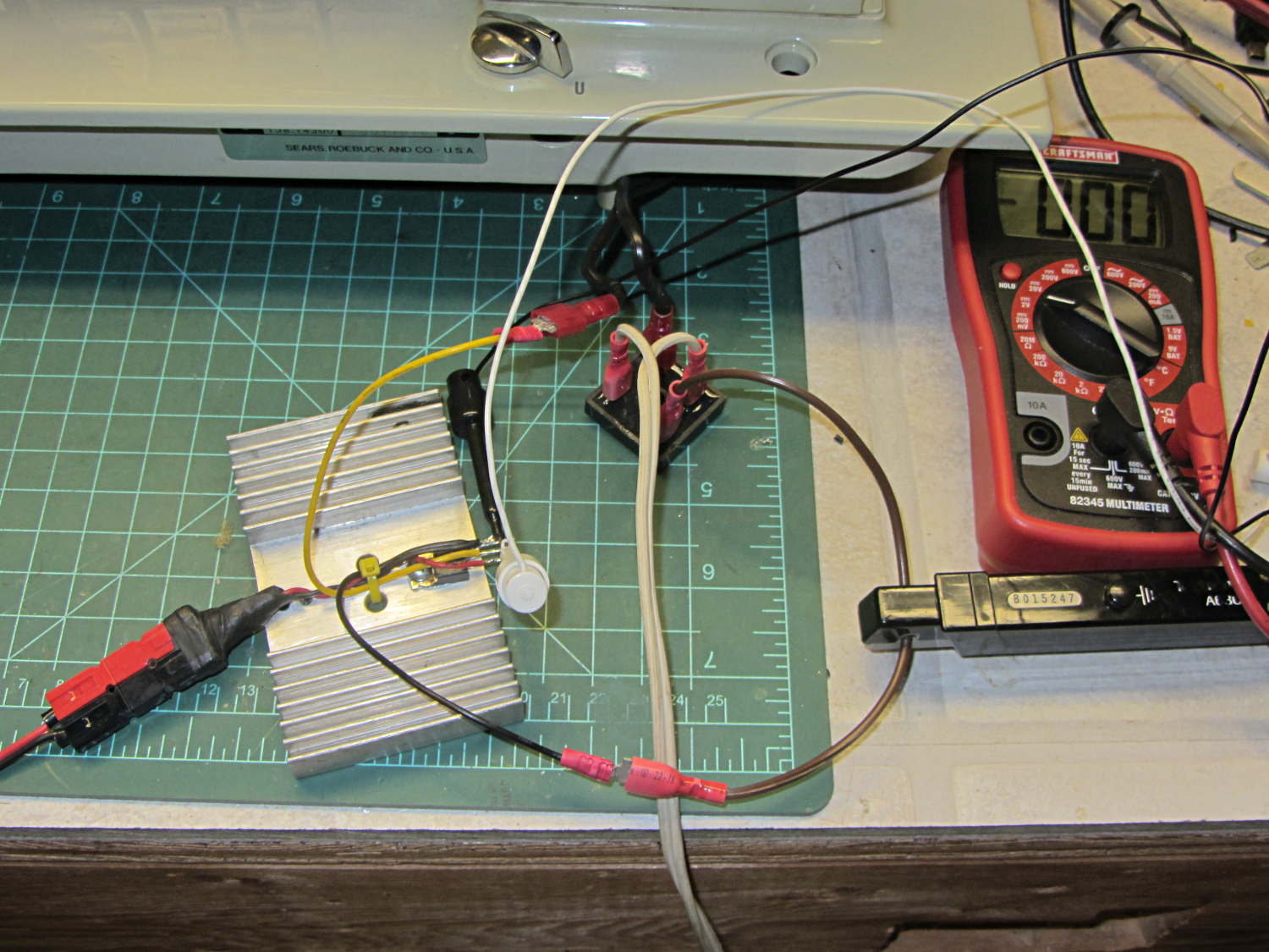 The Kenmore 158 motor has a DC resistance of about 50 Ω, so the locked-rotor current won’t be more than about 3 A. The motor current runs around 700 mA with a voltage drop across the transistor ranging from 20 V to 50 V at normal operating conditions, so it’s just barely within the DC SOA. So far, my efforts to kill it by stalling the motor have been unavailing; I have four spares and Eks has at least five more in his heap.