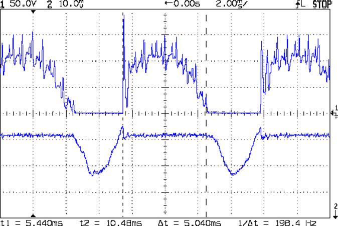 Eyeballometrically speaking, the dissipation averages 50 W = 90 V x 620 mA during those spiky sections where the transistor must absorb the difference between the line voltage and the motor voltage. The cursors say that takes 5 ms of the 8.3 ms period of the 120 Hz full wave rectified power, so the duty cycle is 42% and the average average dissipation works out to 20 W. That’s still enough to warm up that big heatsink; the motor driver will need a thermal sensor and a quiet fan.