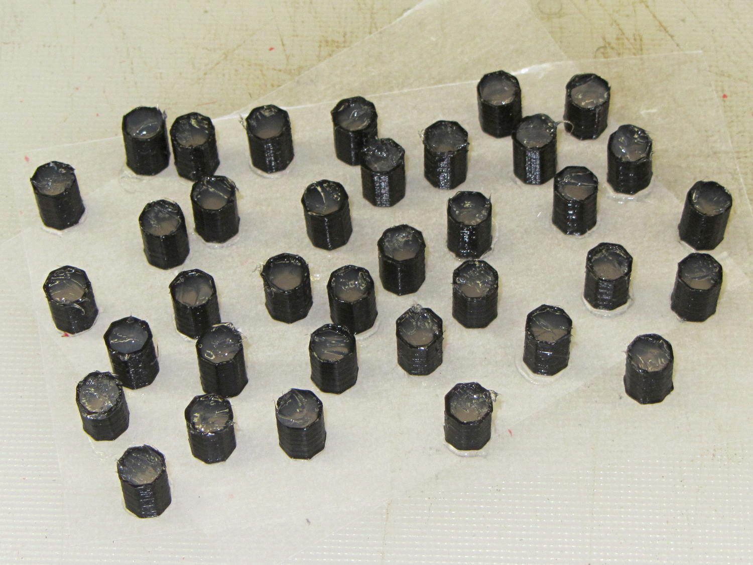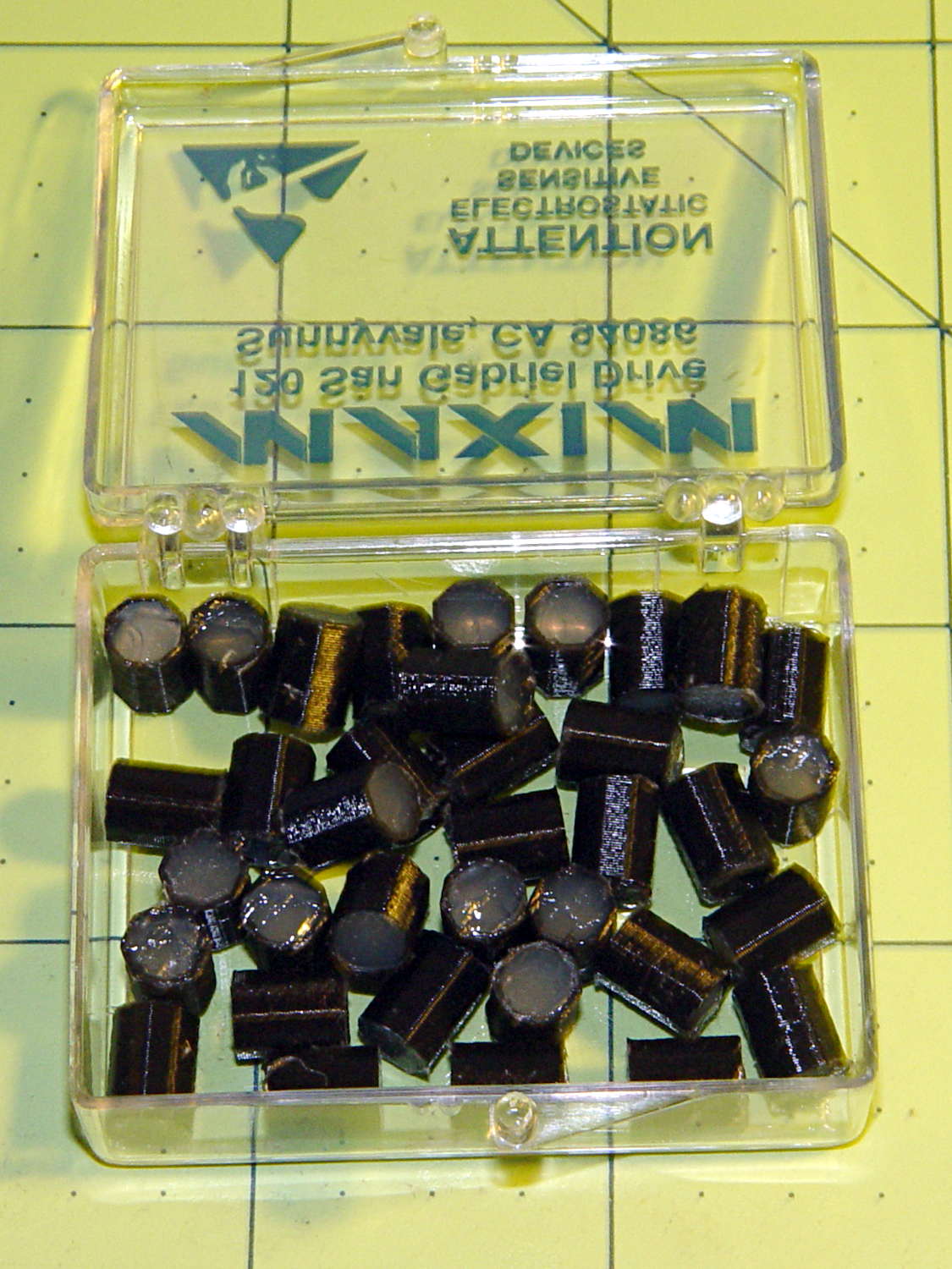 I put the cylinders at the end of the stacks, against the graphite buttons (shown in the top picture), and left the disks to settle themselves against the brass contacts. In retrospect, I should have put the cylinders against the brass, so that the inevitable erosion will chew on the (relatively) easily replaced bulk cylinders.