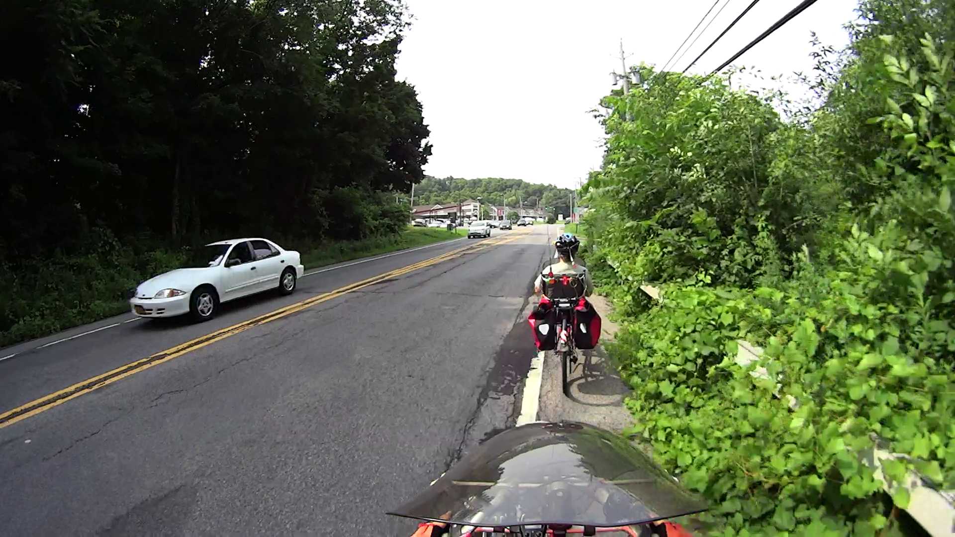 The car has reached the pedestrian ladder across Rt 55, but we’re still crossing the westbound lanes of traffic. Note that I’m lined up with the lane closest to our starting point on Burnett: this is a big intersection. We may not be the fastest riders on the road, but we’re not the slowest, either.