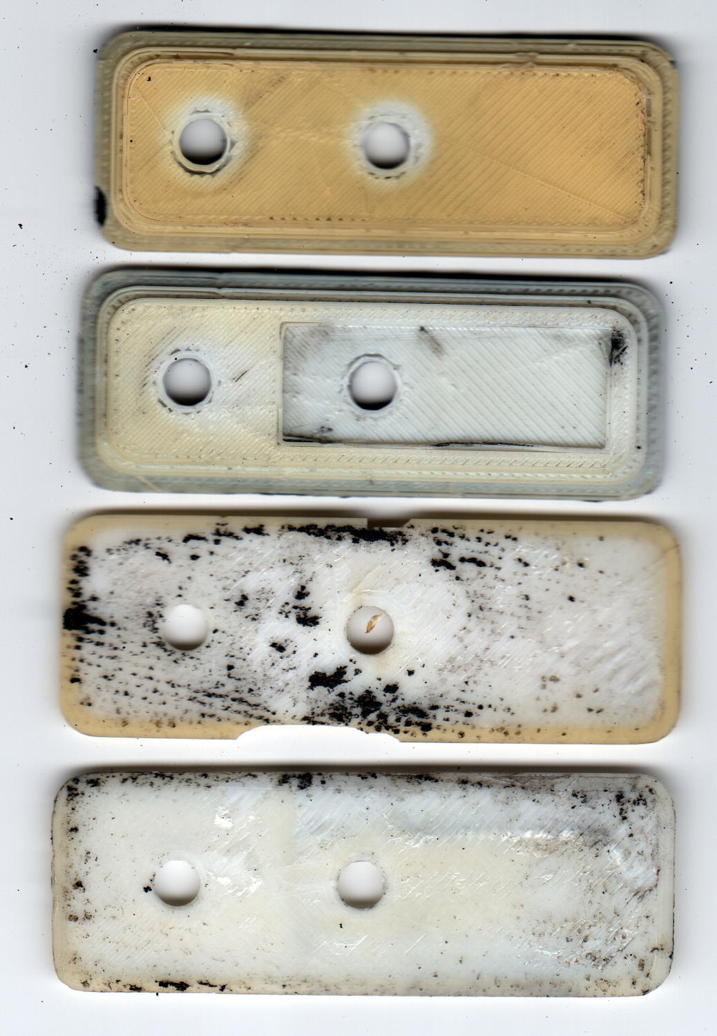 In addition to discoloration, the plates have become brittle, as shown in the chips in third one down, and permanently deformed due to the pressure of the nylon bolts compressing the black foam against the fairing.