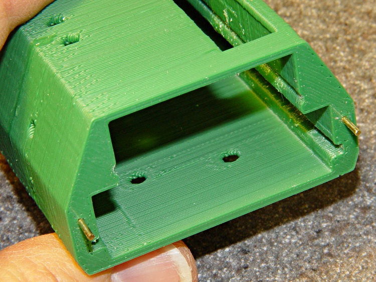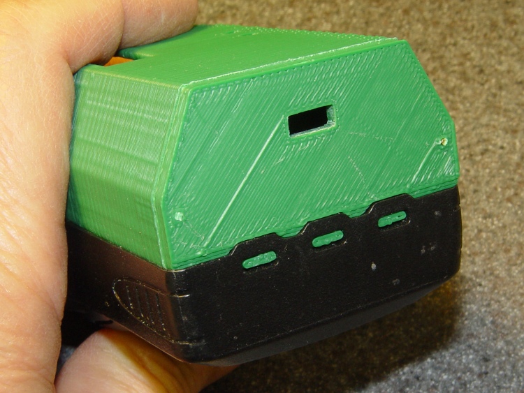 My pudgy finger squeezes into that opening just enough to turn the thing on and off, but pressing on the green plastic bar has no effect. There’s not enough plastic to allow chamfering the edge in the solid model, but a bit of riffler file action worked wonders on those sharp edges.