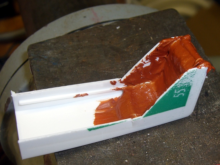 It’s fairly soft stuff, which is what you want in a gasket, so it’ll require support on the bottom and back. Right now, I’m not sure which is which, which is why I troweled the stuff into the mold with one thick side and one thin side.