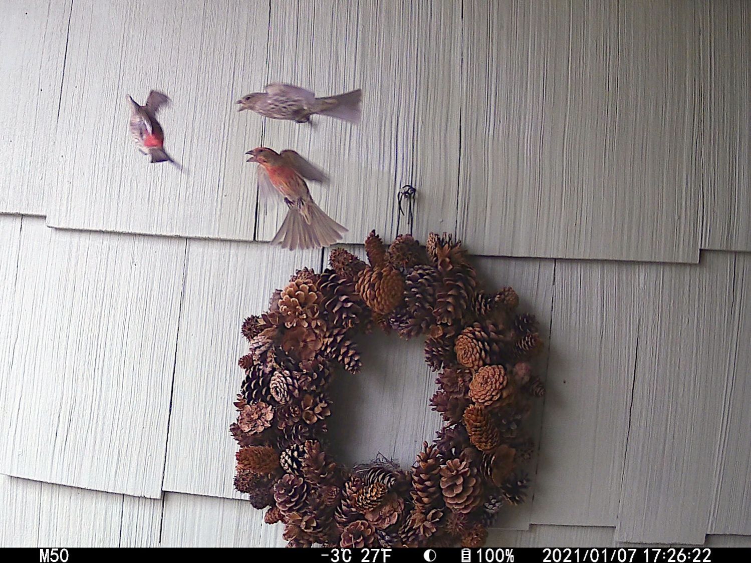 The two finches on the right have been constructing a nest in the wreath hanging at our front door. They tolerate our presence, although they’d be happier if delivery folks dropped packages elsewhere.